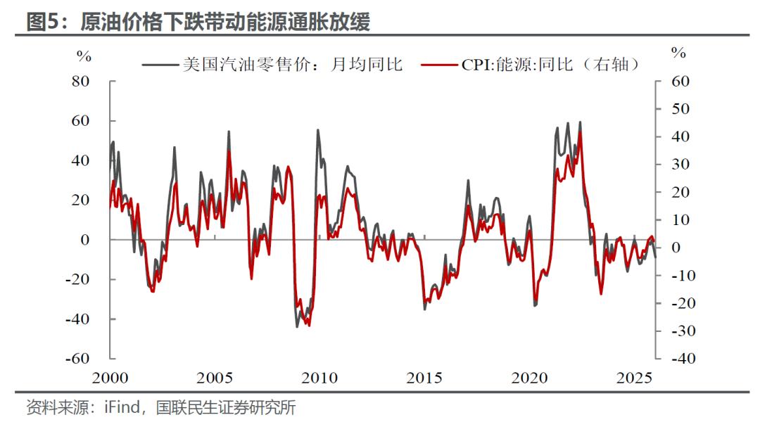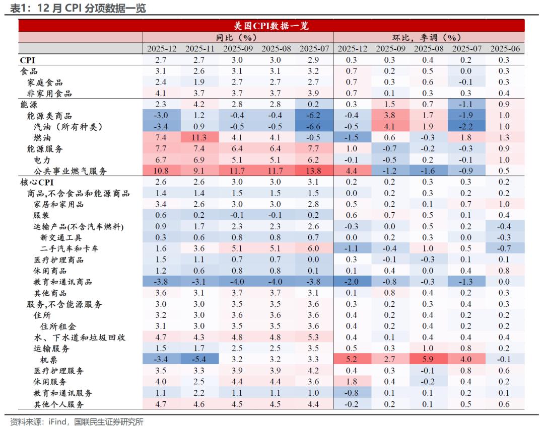 数据公布之前,市场普遍存在对通胀度数反弹的担忧,但最后看来只是虚惊一场。12月美国CPI的表现可谓是给市场吃下了一颗“定心丸”。不同于11月数据受政府停摆、数据估算方法、假日促销等多重因素干扰,12月CPI的统计过程逐步回归常态,数据的质量有所提升,因此通胀环比增速的回升也在意料之中。但整体回升幅度依然不高,尤其是核心CPI环比增速仅0.2%,明显低于预期的0.3%,此外CPI和核心CPI同比增速均持平前值,并未有进一步的走强,这也出乎市场预料。