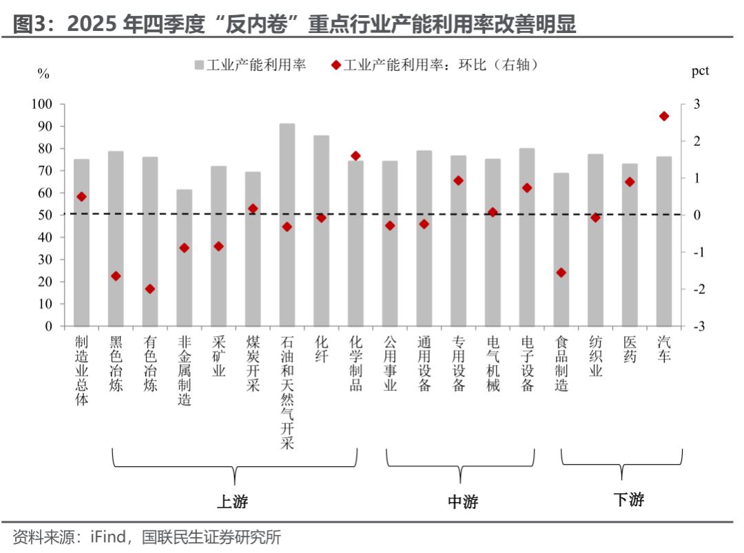 当然,“反内卷”也为产能利用率带来好消息。自2025年二季度以来,工业产能利用率已持续回升。尤其是作为“反内卷”重点行业的煤炭开采、电气机械、汽车等,其四季度产能利用率环比迎来改善。