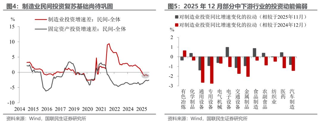制造业:民间投资复苏基础尚未稳固。2025年12月制造业投资增长动能有所减弱,同比增速为-10.6%(11月为-4.5%),背后折射出在内外部局势存在不确定性的情况下,民间投资的信心尚未完全复苏。相较于11月而言,通用设备、专用设备、交通设备、汽车制造等中下游行业投资增速放缓较为显著。