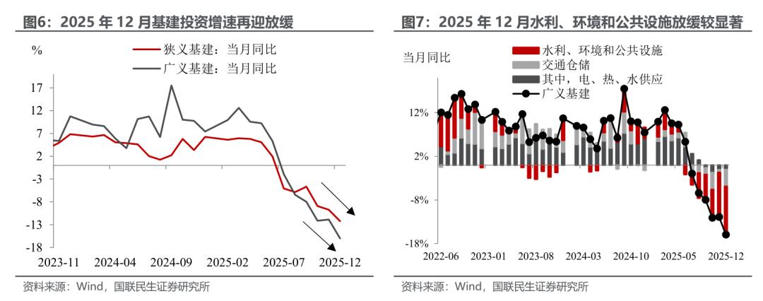 基建:增速再放缓,“开门红”底色几何?2025年12月基建投资增速再迎放缓,狭义基建投资同比增速从11月的-9.7%进一步降至-12.2%,其中水利、环境和公共设施板块的拖累相对较大,基建投资拐点仍暂未显现。
