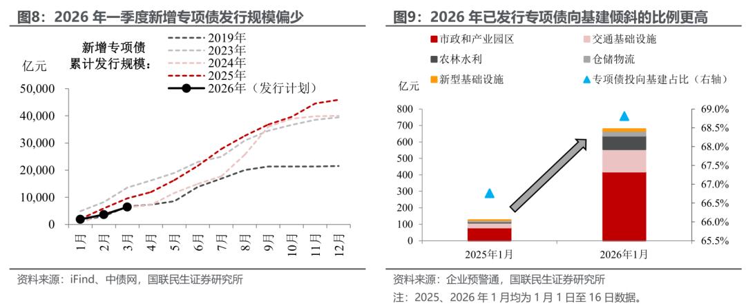 不过往后看,2026年一季度基建有望重拾升势。虽然地方政府已公布的一季度新增专项债计划发行规模并不算高,但2026年以来已发行专项债投向基建的占比明显高于上年同期。同时结合高频数据来看,当前高炉开工率、磨机运转率、水泥发运率等指标均处于历史同期较高位,证实开年“稳基建”的重要性。