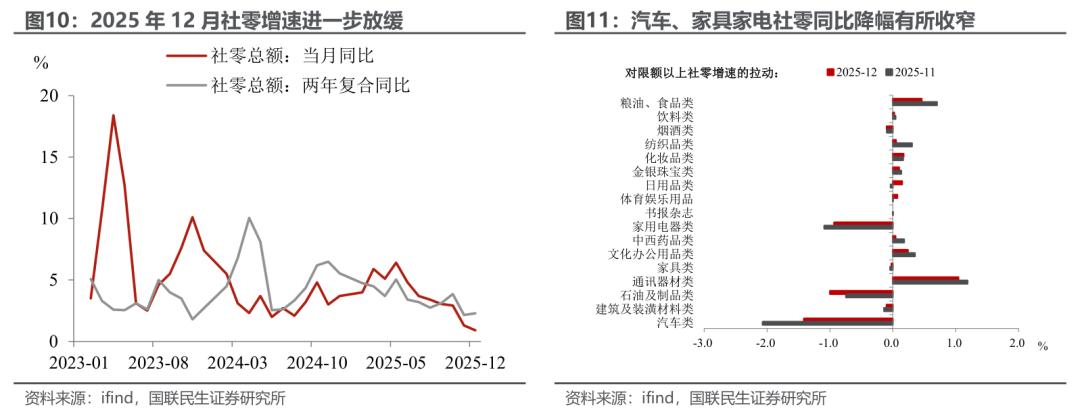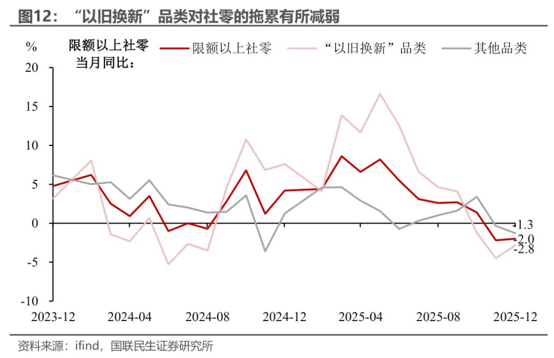 消费:社零增速延续放缓,但“以旧换新”品类释放出积极信号。2025年12月社零同比增速延续放缓态势,回落至0.9%(前值1.3%),创2023年以来新低。不过结构性积极信号显现,以旧换新相关品类消费边际改善:汽车、家具家电品类同比降幅均有所收窄,对社零的拖累效应减弱;通讯器材、文化办公用品则延续高位增长态势。究其原因, 我们认为一方面是前期“双十一”促销活动前置对社零的节奏性扰动逐步消退;另一方面临近年末居民消费需求回暖,对相关品类增速回升形成一定支撑。